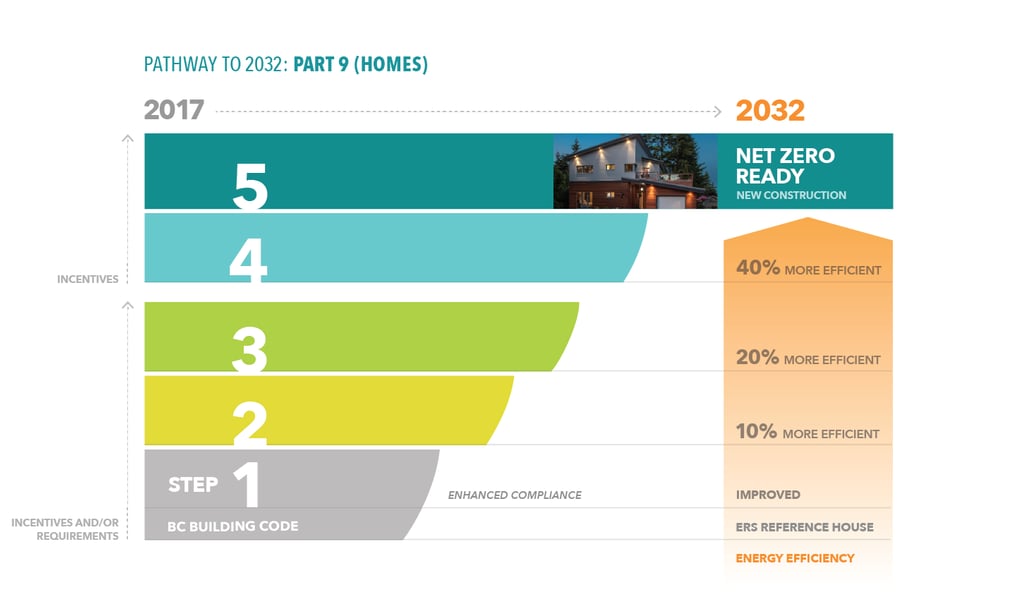 Energy efficiency requirements are grouped into steps. Every few years the minimum step rises. This guides the industry towards net-zero energy ready buildings by 2032.