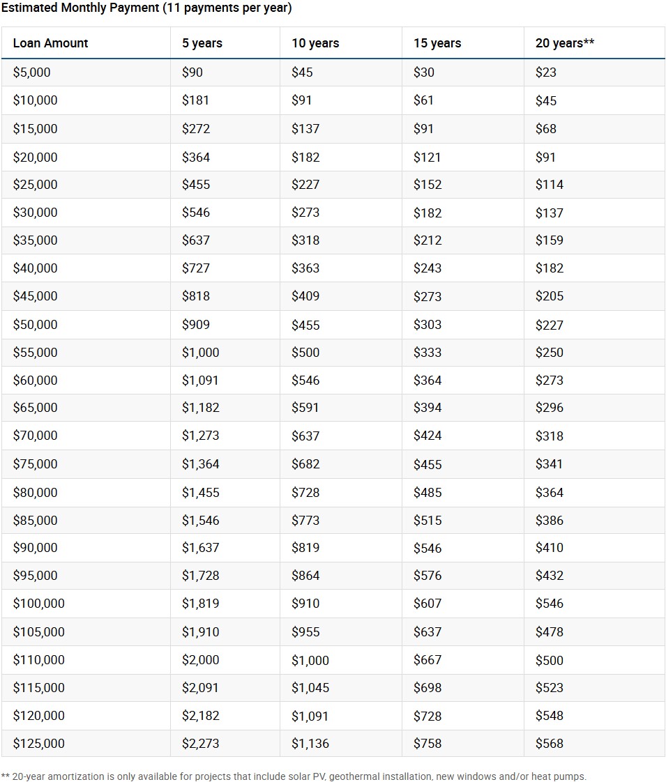 Note: Projects that include any of the following measures: solar, windows, geothermal and/or heat pumps are eligible for a 20-year term.